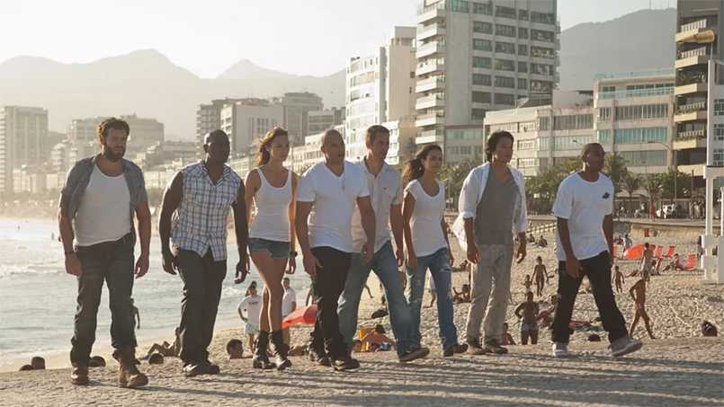 Именно в этом фильме «Форсаж» приобретает совсем гротескно-эпический масштаб. Никаких криминальных гонок — это зрелищный и нарочито безмозглый блокбастер. Здесь на автомобиле таранят поезд, а еще уничтожают половину Рио-де-Жанейро гигантским сейфом, который привязан к машинам стальными тросами.