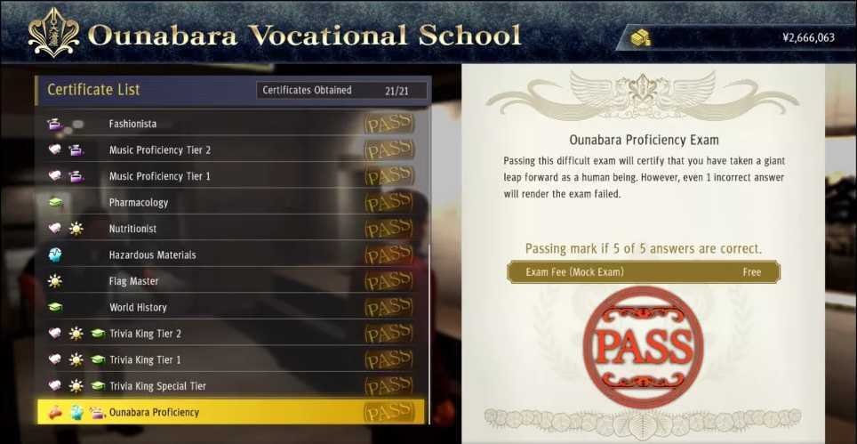 Экзамен на знание Ounabara отличается от других экзаменов, на которые вы только что ответили. Вместо уникальных вопросов этот экзамен предлагает вам ответить на все вопросы, на которые вы ответили ранее, и снова ответить на них в этом экзамене. Кикер? Если вы ответили неверно на один вопрос, значит, вы его провалили. Правильно, не более трех из пяти вопросов достаточно для сдачи. Неа. Вам нужно будет получить 5 баллов из 5 возможных.
