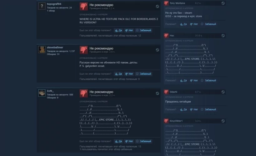 Ревью-бомбинг. За примером далеко ходить не надо: после того, как Borderlands 3 объявили временным эксклюзивом Epic Store, разъярённые геймеры ринулись на страницы первых частей в Steam и стали топить их плохими рецензиями.