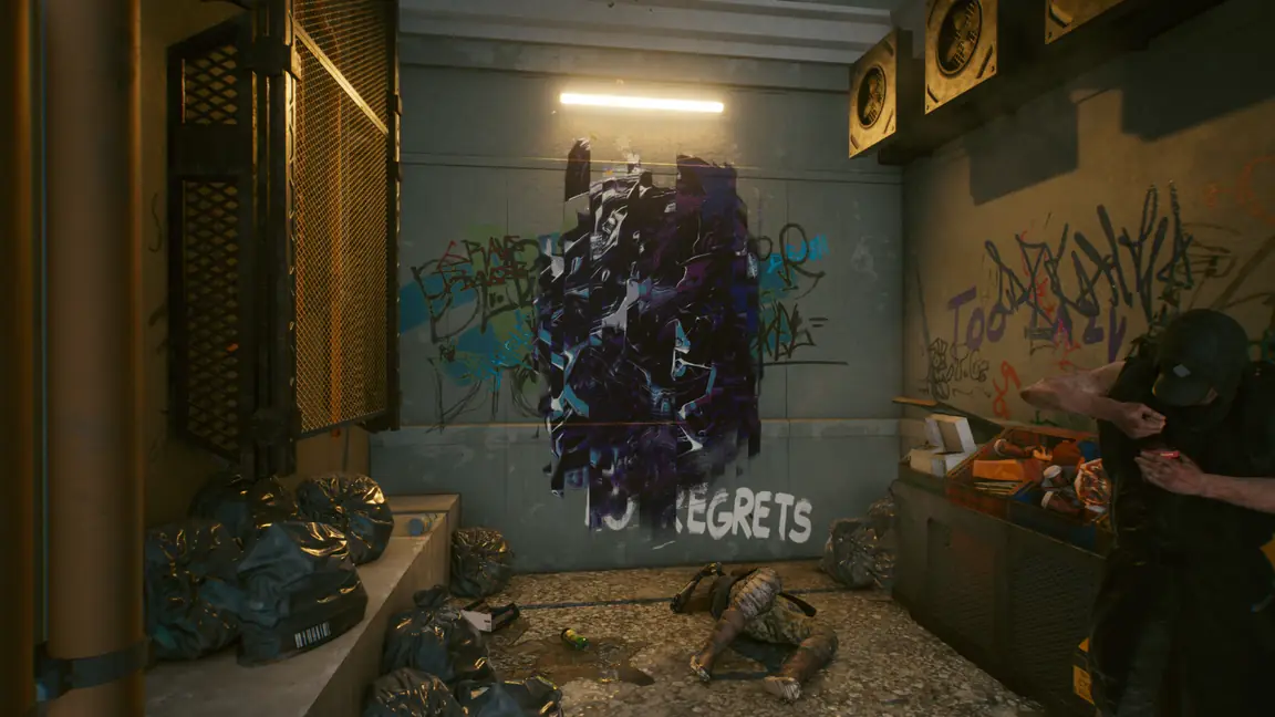 В комнате секретного разработчика стоит диван напротив большого телевизора. Если сесть на диван, включится телевизор и рядом с вами появится Джонни Сильверхэнд. Он начнет играть на гитаре музыку в стиле эмбиент, а на экране будут появляться изображения разработчиков. Здесь нет никаких секретных предметов или осколков скрытой истории, но это все равно забавный маленький карман, который можно обнаружить в хаосе Ночного города.