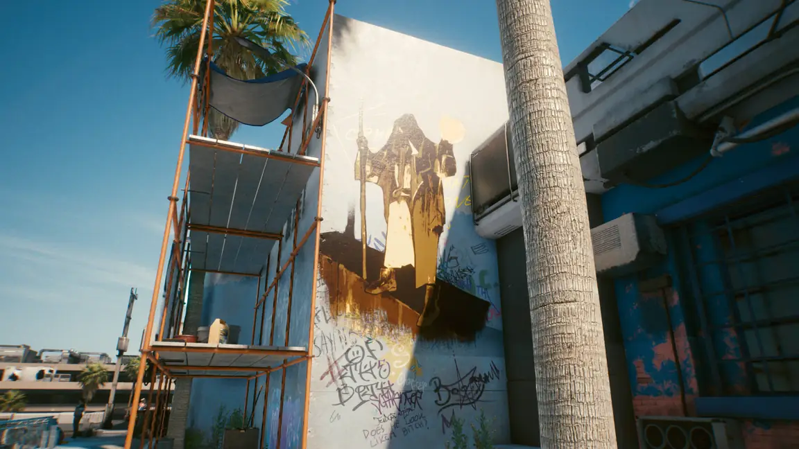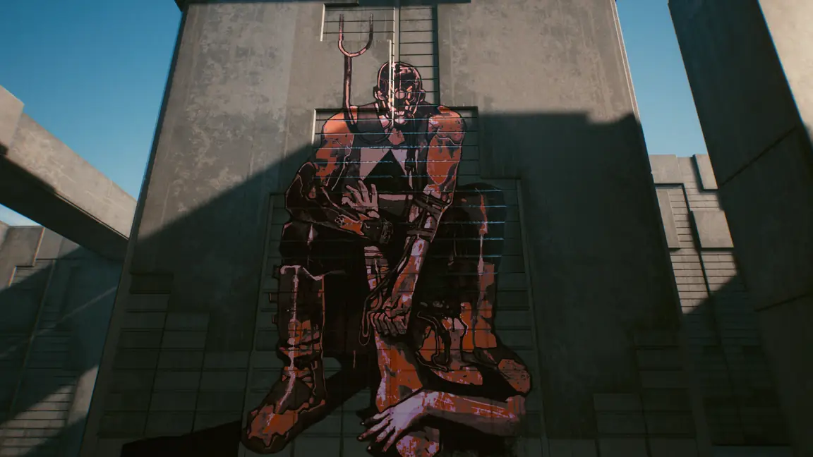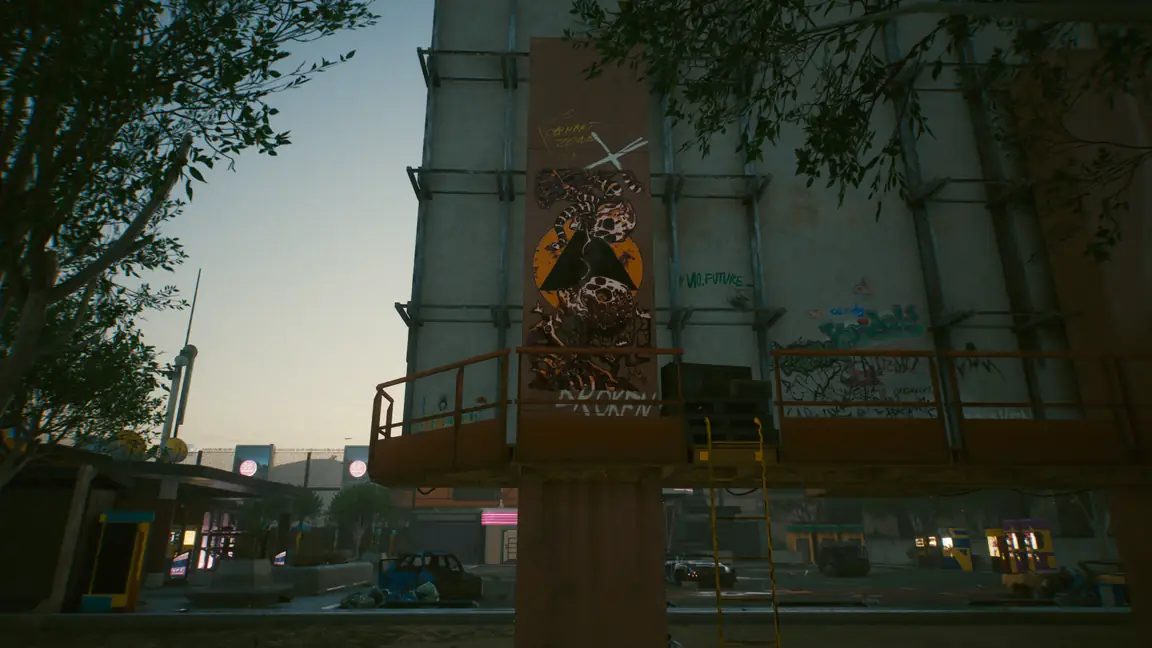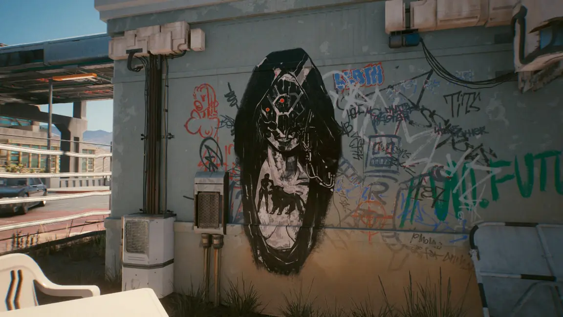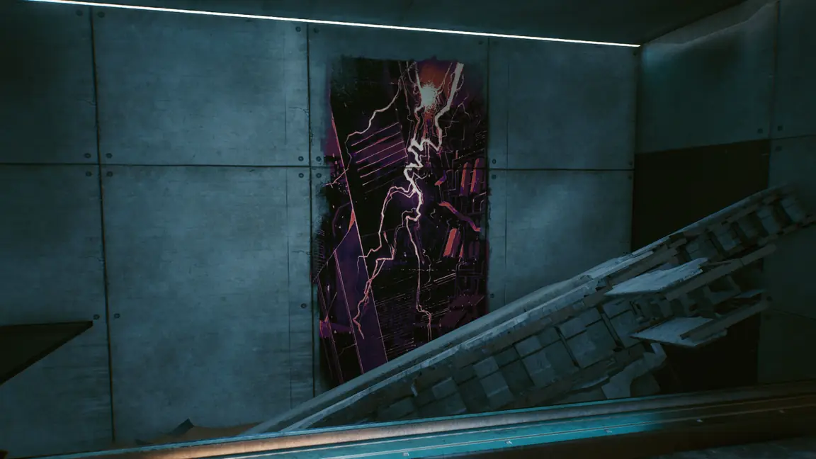 Спуститесь по лестнице на строительную площадку Corpo Plaza. Поверните направо, и вы увидите на стене граффити карты Таро для Башни.