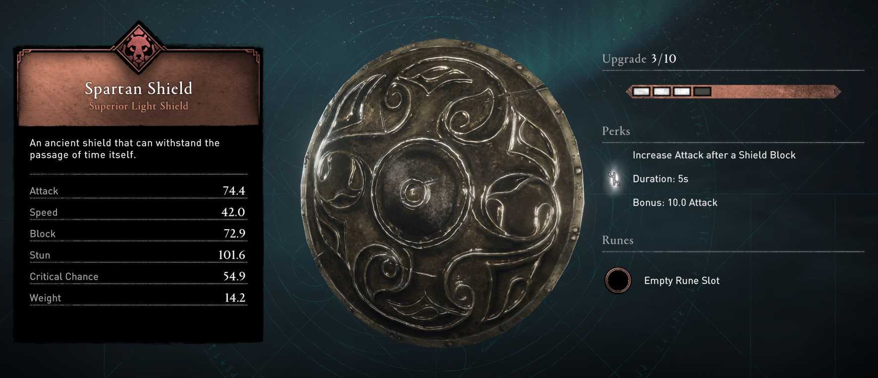 У Спартанского щита самый высокий показатель блока световых щитов в игре. Уникальная особенность этого легкого щита — увеличить урон от оружия после успешного блокирования или парирования. Как тот, кто много парирует, у вас будет много сил для парирования этим великолепным оружием. В сочетании с оружием, таким как Коготь Суттунгра и Длинный меч Каролингов, ваш урон значительно возрастает.