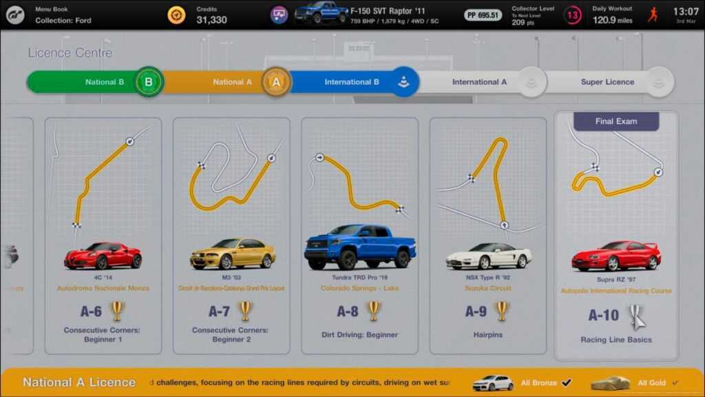 Выполнив несколько меню, вы откроете знаменитый Лицензионный центр, где игроки соревнуются в испытаниях, которые научат вас эффективно управлять автомобилем. В меню, привязанном к центру лицензирования, вам будет предложено просто пройти первую пробную версию, но стоит пройти все 10 пробных версий, чтобы получить лицензию категории «В» и даже перейти к лицензии категории «А», прежде чем делать что-либо еще. Более поздние чемпионаты требуют, чтобы у вас были эти лицензии, поэтому они необходимы для продвижения, но они также дают вам приличную сумму денег и новые автомобили, особенно если вы выполнили все требования к золоту, поэтому их стоит сделать как можно скорее.
