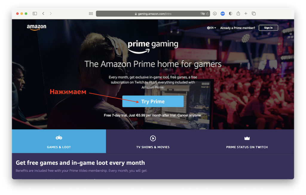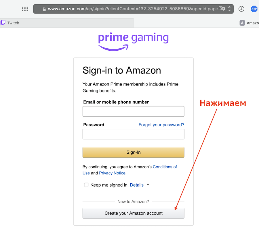 Нас перебрасывает на сайт подписки Prime Gaming от Amazon.