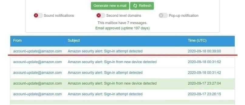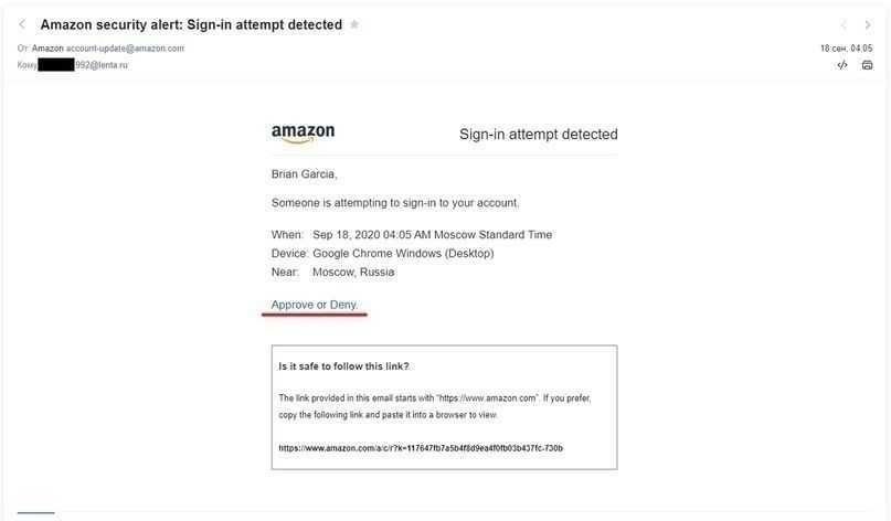 От: account-update@amazon.comТема:Amazon security alert: Sign-in attempt detectedВремя: Минуту назад (часы указаны по UTC)