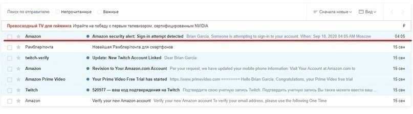 Щелкаем обычно на 1 письмо сверху, где нас просят подтвердить вход в Амазон-аккаунт.