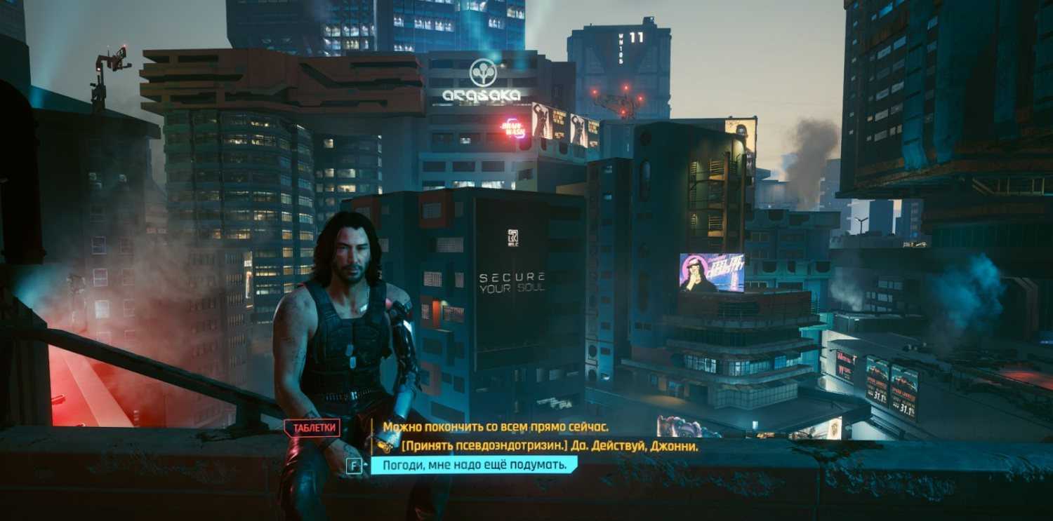 Ещё про секретную концовку можно почитать здесь: Cyberpunk 2077: Все концовки (8 концовок)  Все другие варианты приведут к гибели разных персонажей. А концовка с доверием Ханако, мягко говоря, далека от идеала. Так вот, вместо этого Джонни предложит отправиться в Арасака-Тауэр в одиночку, не принимая никаких таблеток. Так, чтобы и он, и Ви были в сознании. Спросите, есть ли у него план, а затем согласитесь напасть.