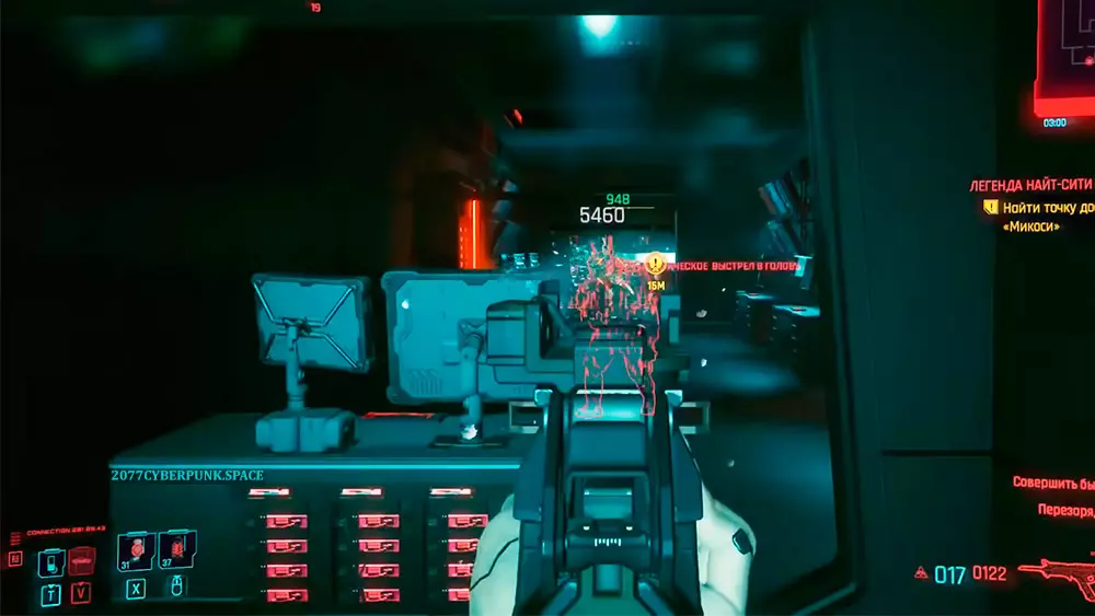 Очередная резкая смена сцены. Это явно тот комплекс, в котором живет Ви. Это место мы видели в прошлогоднем геймплее. Что подтверждается тренирующимися NPC. Как видно на интерфейсе, при наличии четвертого уровня взлома можно преодолеть защиту и заставить робота убить все врагов в округе.