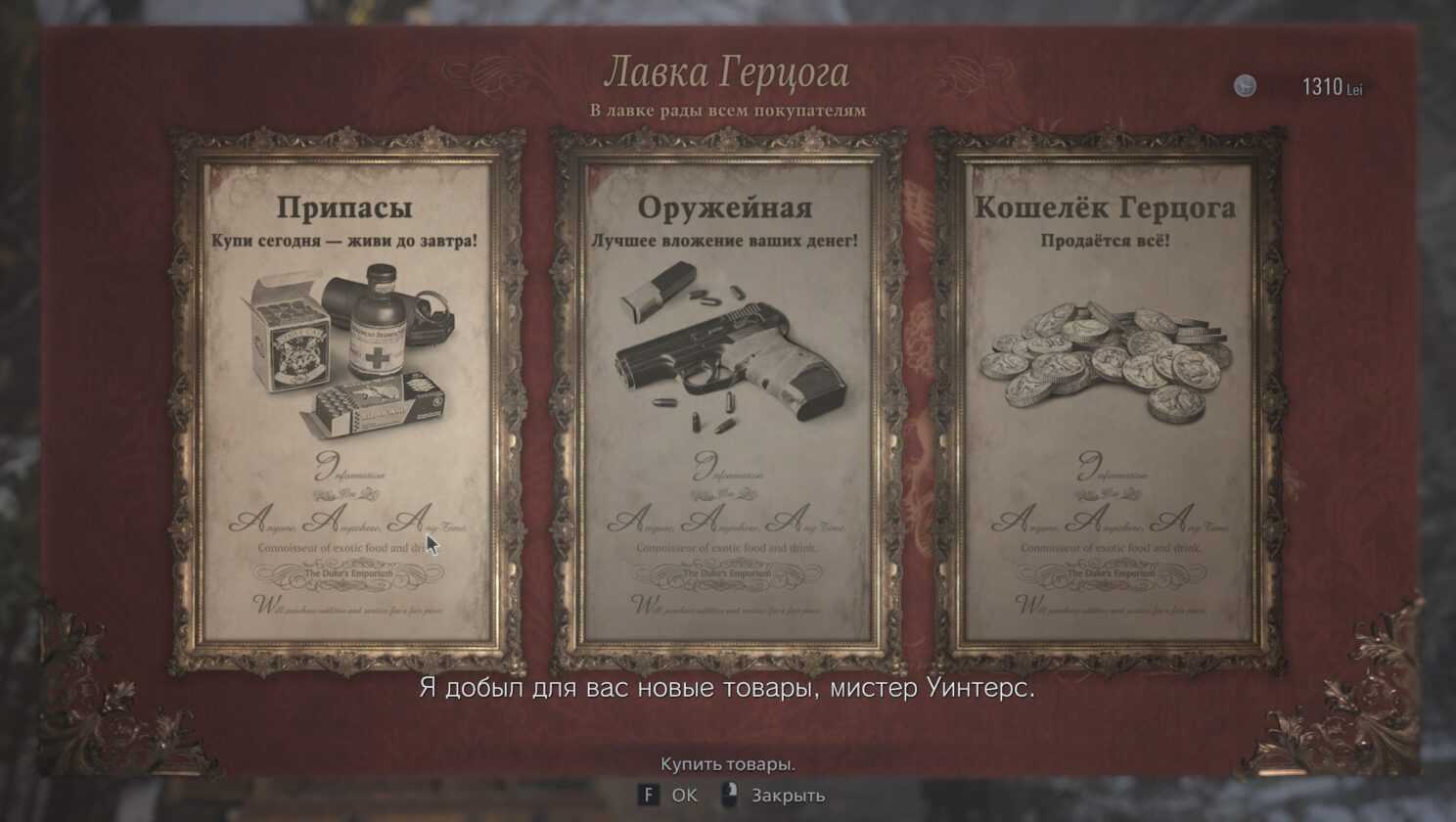 В отличие от Resident Evil 7 в этой части появился торговец по имени Герцог. У него можно купить патронов, схемы создания припасов или улучшения для оружия. Но игру нельзя превратить в ураганный шутер — патронов у Герцога продаётся ограниченное количество. Платить вам придётся местной валютой, которая или выпадает из врагов, или спрятана в разных местах на уровнях. Также Герцог принимает разного рода драгоценности: статуэтки, куклы, золотые кубки и кристаллизованные остатки особо сильных врагов.