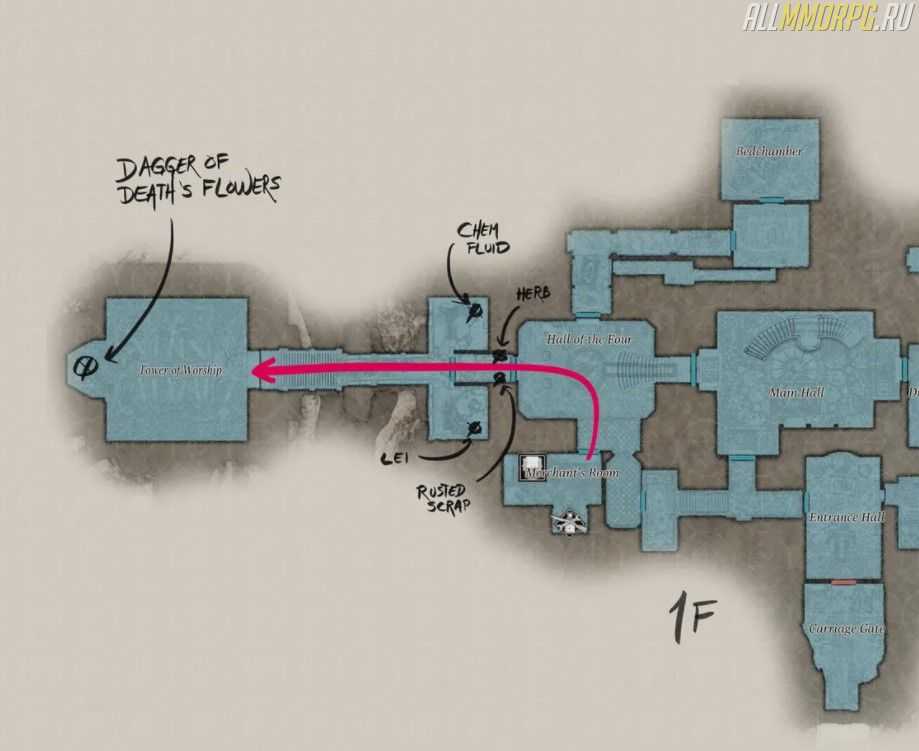 Во внутреннем дворе будет лишь одна открытая дверь. Войдите внутрь и поднимитесь на второй этаж. Там сможете найти карту и комнату с четырьмя статуями.