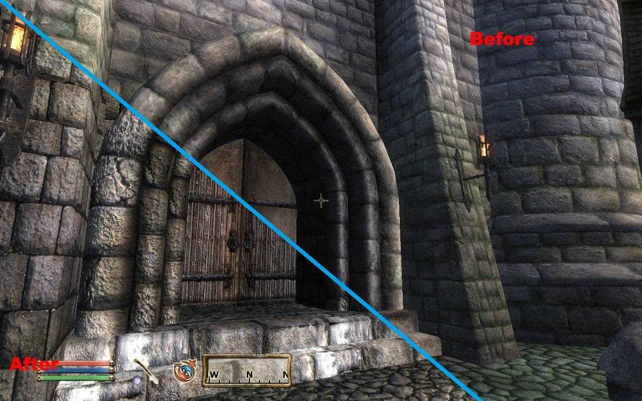 На картинке показано, насколько он улучшает внешний вид окружения – но, внимание, не меняет броню, оружие, НПС и небо. С ним Обливион уже выглядит будто это игра не из 2006, а хотя бы из 2011 – как Batman: Arkham City
