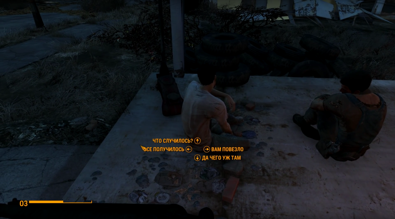 Во-вторых, тут есть, ставший уже небольшим мемом, вариант ответа, который называется «». Ты вообще не можешь представить, что ляпнет герой. Обычно это вовсе не сарказм, а какая-то дебильная идиотская шутка. Но знаете что? Это не слишком мешает игре, потому что Bethesda, на мой взгляд, и в третьей части, где были классические диалоги, не особо хорошо их написала. Диалоги всё равно были слабой частью игры. Так получилось и в этот раз. Тут даже не колесо виновато. Когда ты слушаешь их, у тебя уши просто вянут от того бреда, который несут герои. Колесо только ускоряет этот процесс.