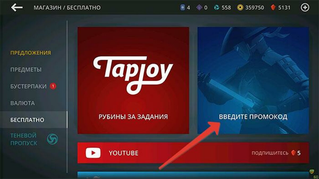 - Перейти во вкладку «Бесплатно» и нажать на «Введите промокод».