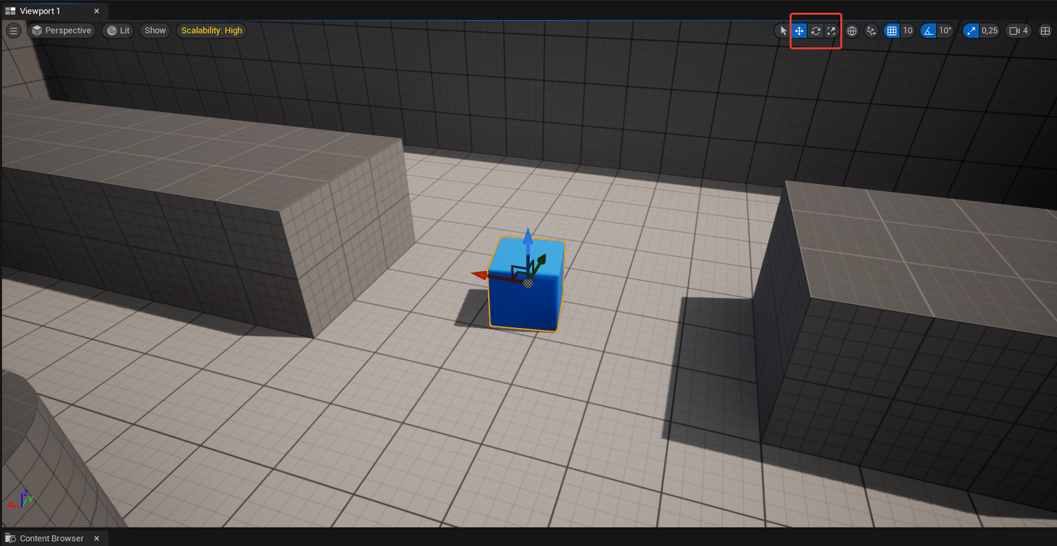 Самые простые операции с объектами в Unreal Editor — это перемещение, вращение и масштабирование. Эти три режима расположены в верхней правой части вьюпорта.