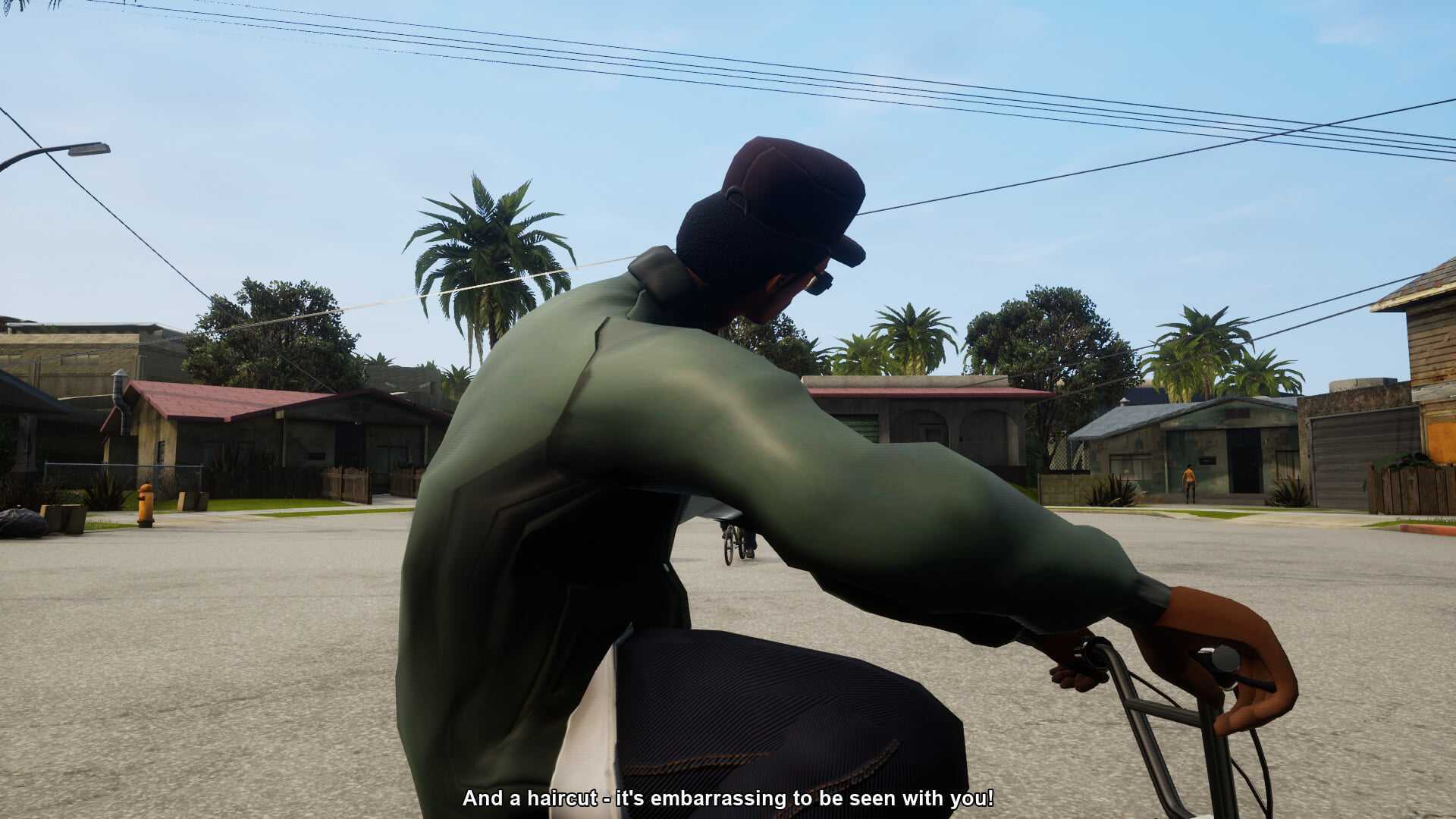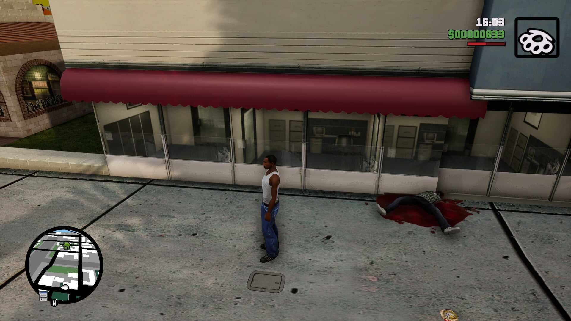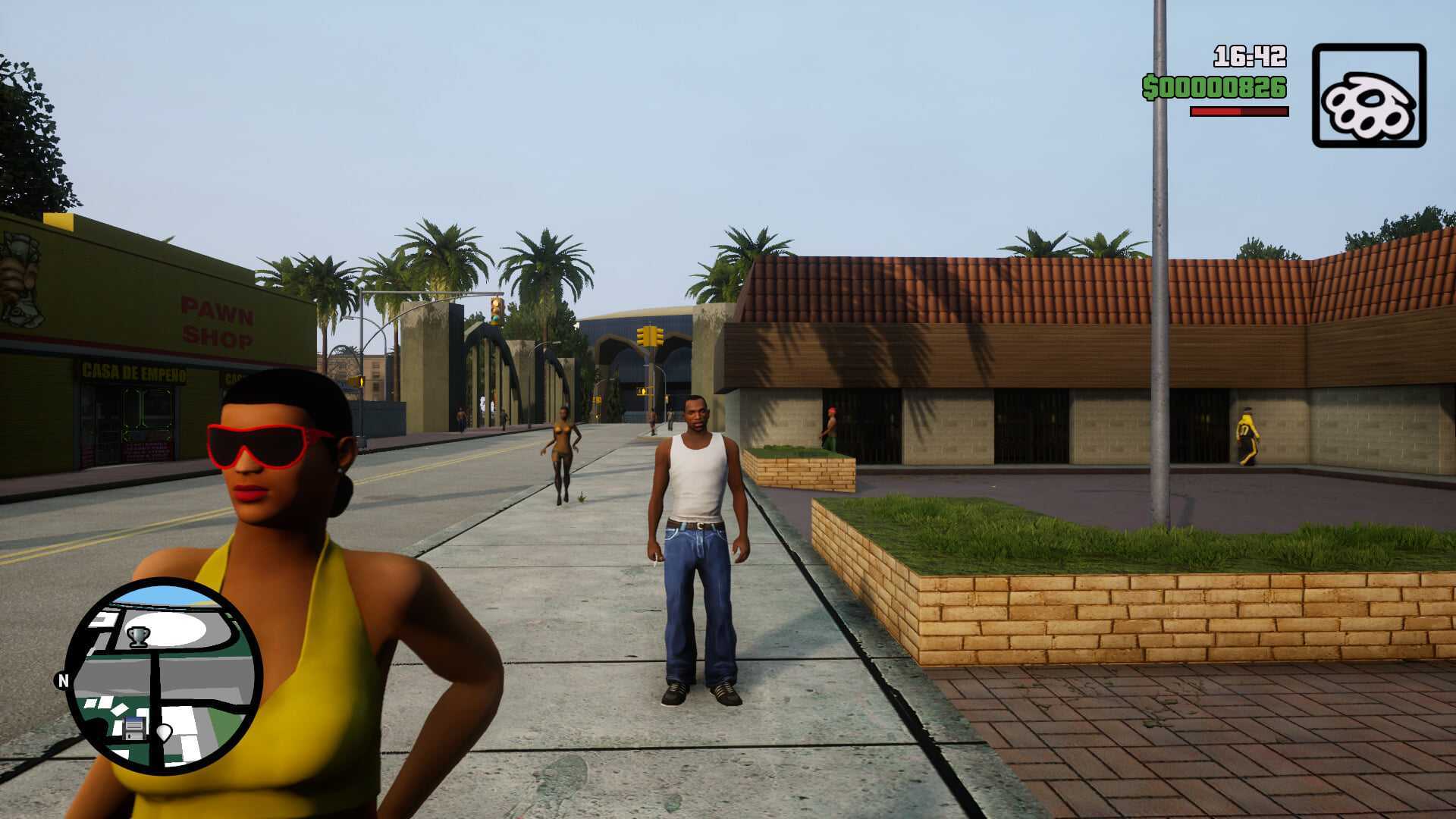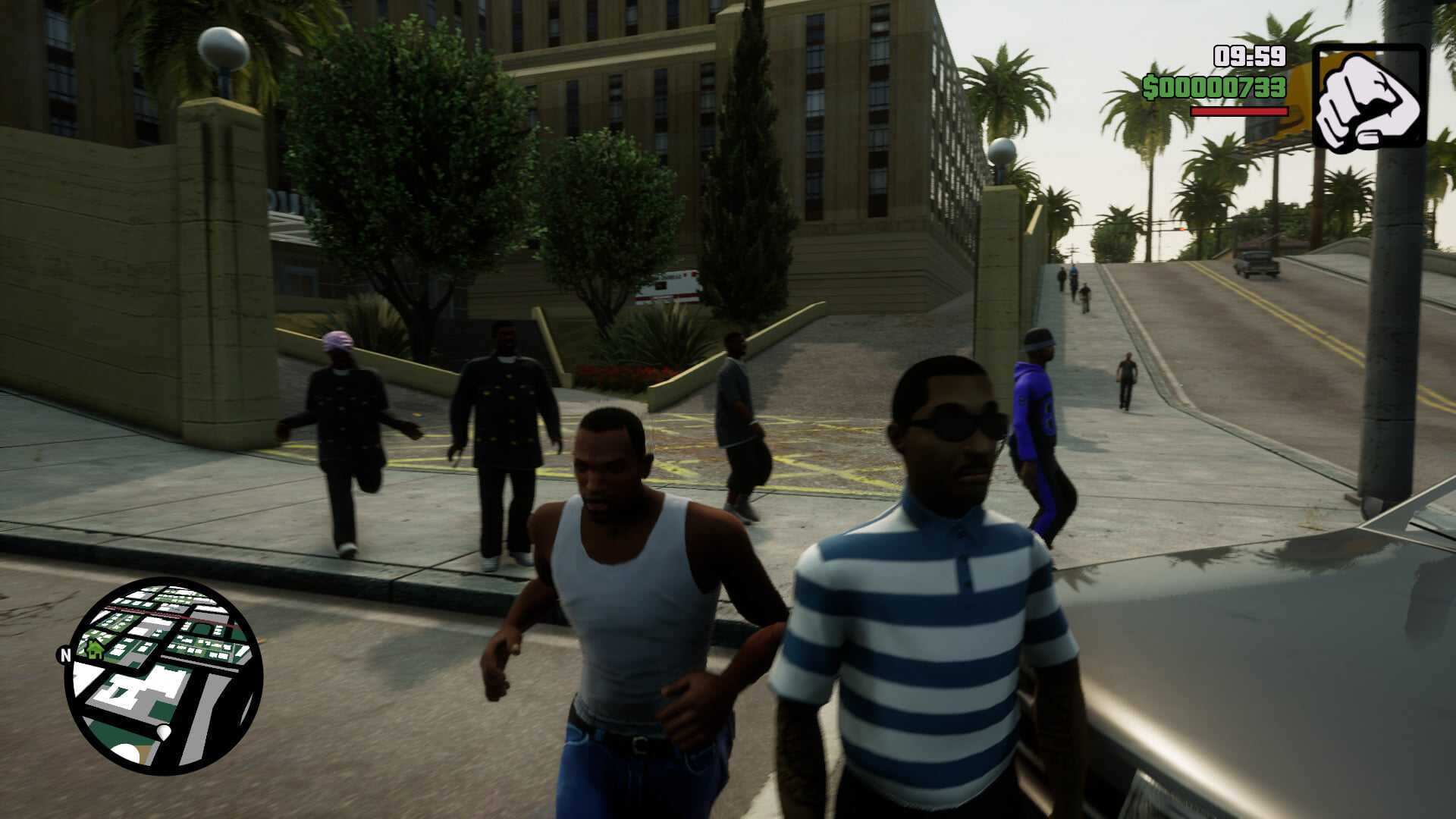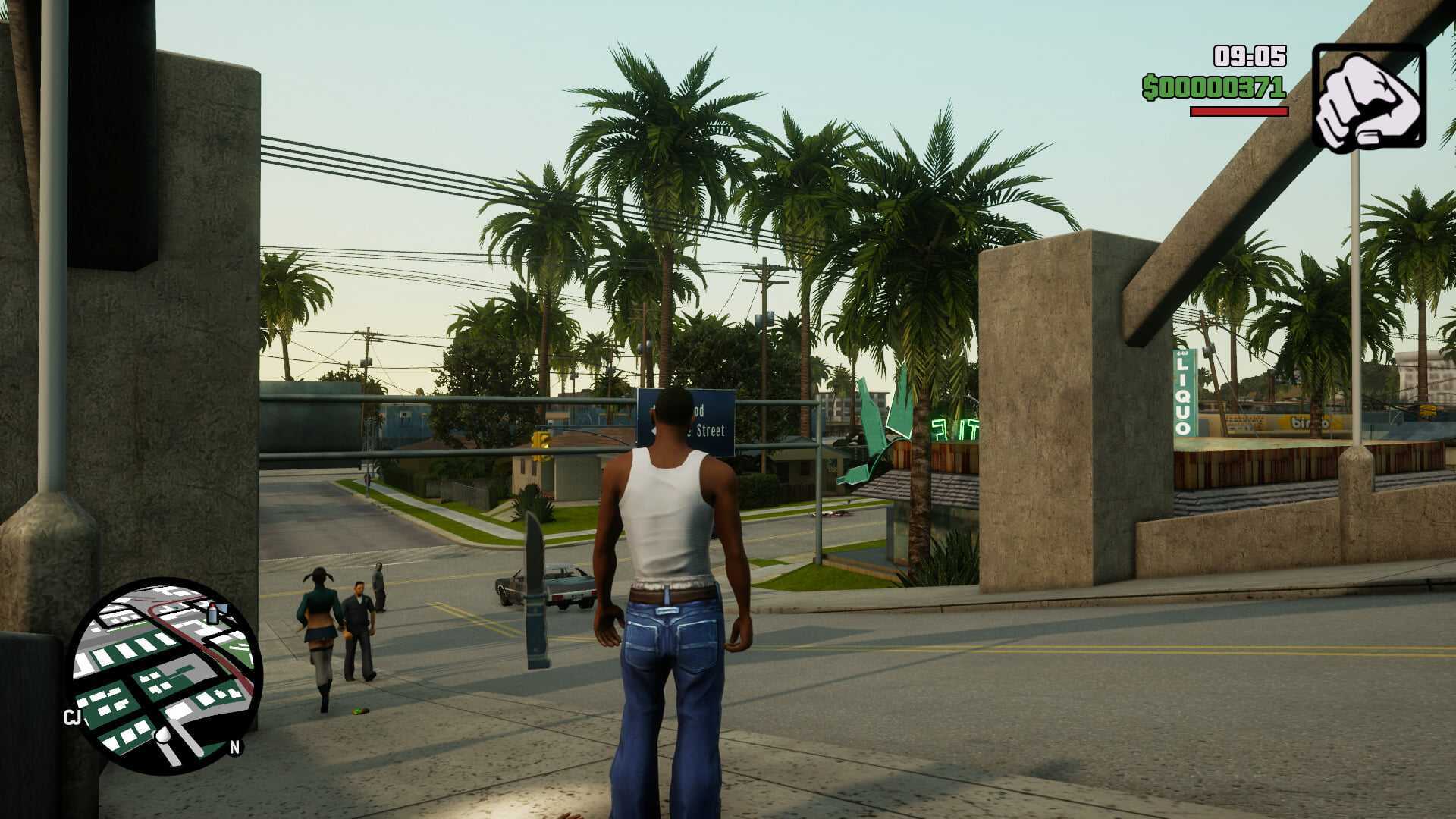 Теплый оранжевый свет калифорнийского солнца перенесли в San Andreas из GTA V. В оригинальных версиях игры свет был бледнее, а насыщенность в разы ниже. И что происходит, если совместить гладкую, «исправленную» для ремастера текстуру темной кожи с адской насыщенностью и динамическим светом?