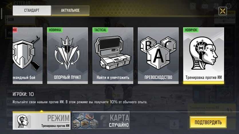 В игре есть режим «Тренировка против ИИ», который позволяет вам играть против ботов. Он отлично подходит для оттачивания навыков передвижения и стрельбы, испытания комплектов снаряжения и изучения карт.