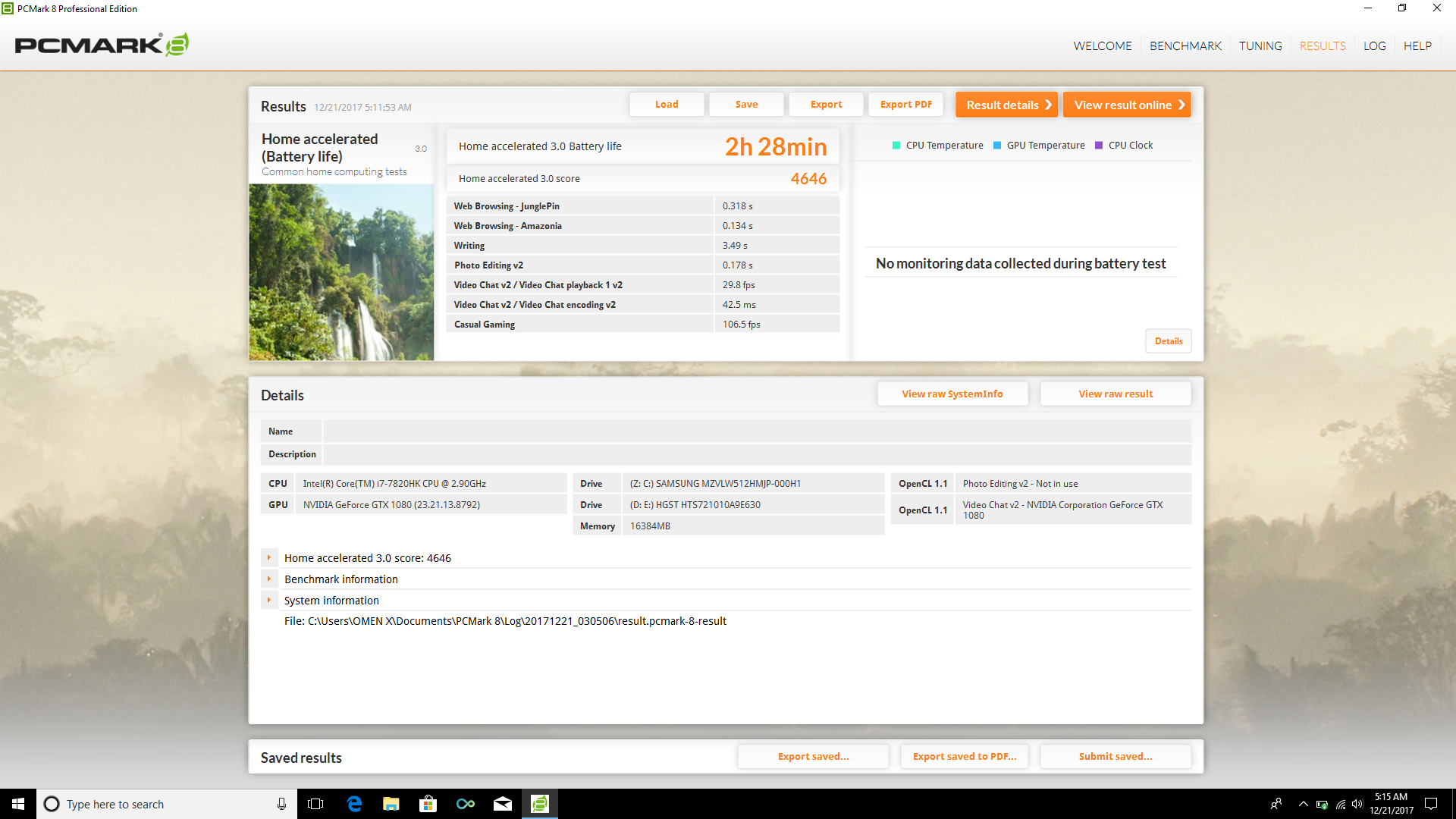 В тесте автономности PCMark 8 под нагрузкой HP Omen X продержался 2 часа 28 минут, что является хорошим результатом, как для игровой модели.
