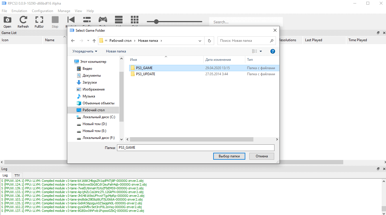 Нажмите File > Boot Game или Open и укажите расположение папки PS3_GAME. Нажав кнопку Выбор папки, начнётся процесс установки игры. Дождитесь завершения и в новом окне запустится игра.