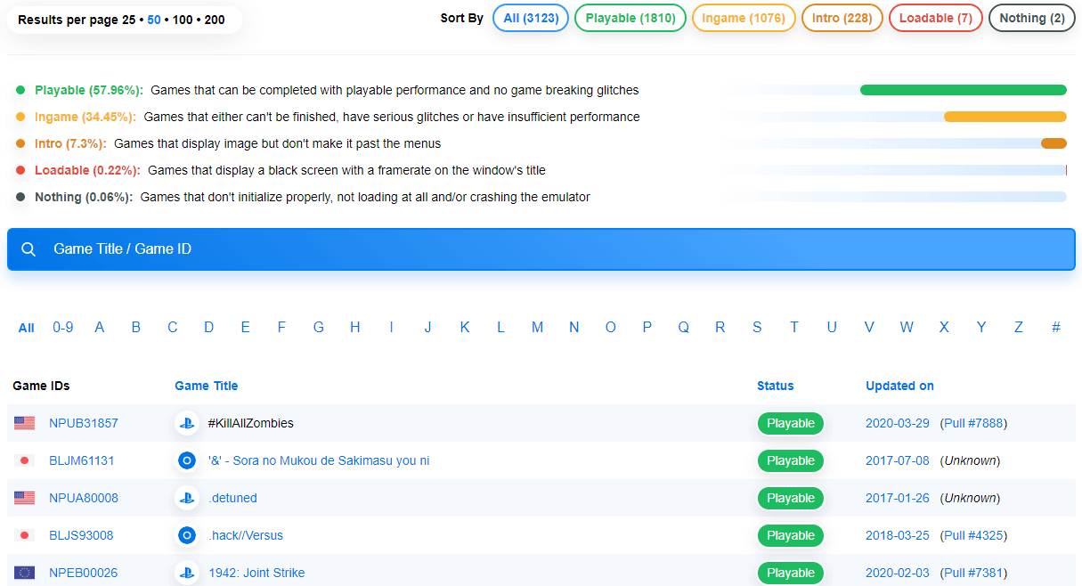 Загружайте игры только с зелёной отметкой Playable. Это значит что она уже была протестирована и её можно пройти без проблем. Все другие цвета говорят, что поиграть нормально не получится.