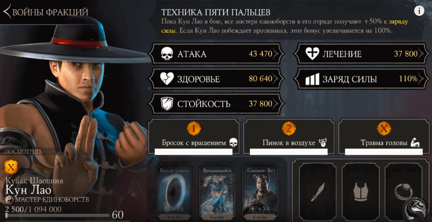 Тип персонажа. В Mortal Kombat Mobile существует шесть основных типов персонажей: мастера единоборств, спецназовцы, выходцы из Преисподней, представители Внешнего мира, старшие бога и кочевники. Некоторые профили могут воздействовать на определенный тип, давая различные бонусы этим персонажам в вашем отряде.