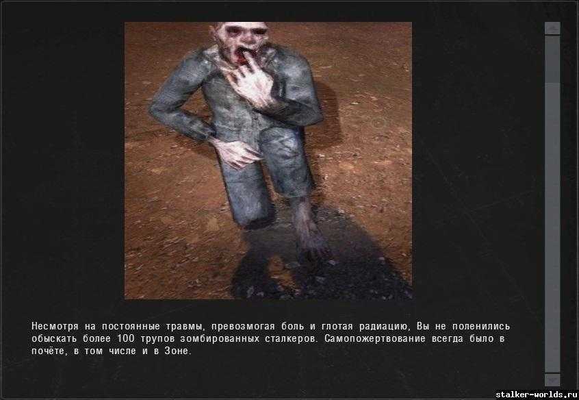 Друг зомби Получение: Обыскать 100 зомбированных сталкеров  Дуплет Получение: Цепочка Стаханова