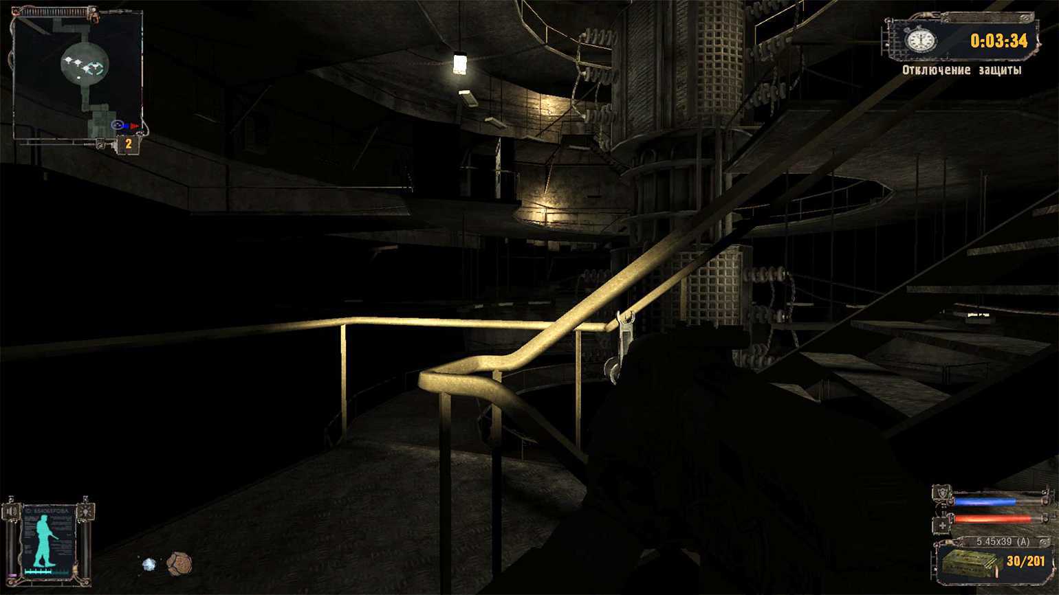 После коридора спуститесь на нижний уровень и пройдите через расщелину в стене, где засело около семи врагов. Затем отыщите лестницу наверх, которая в конце охраняется монолитовцами. Чтобы не выдать себя, поднимайтесь без света.
