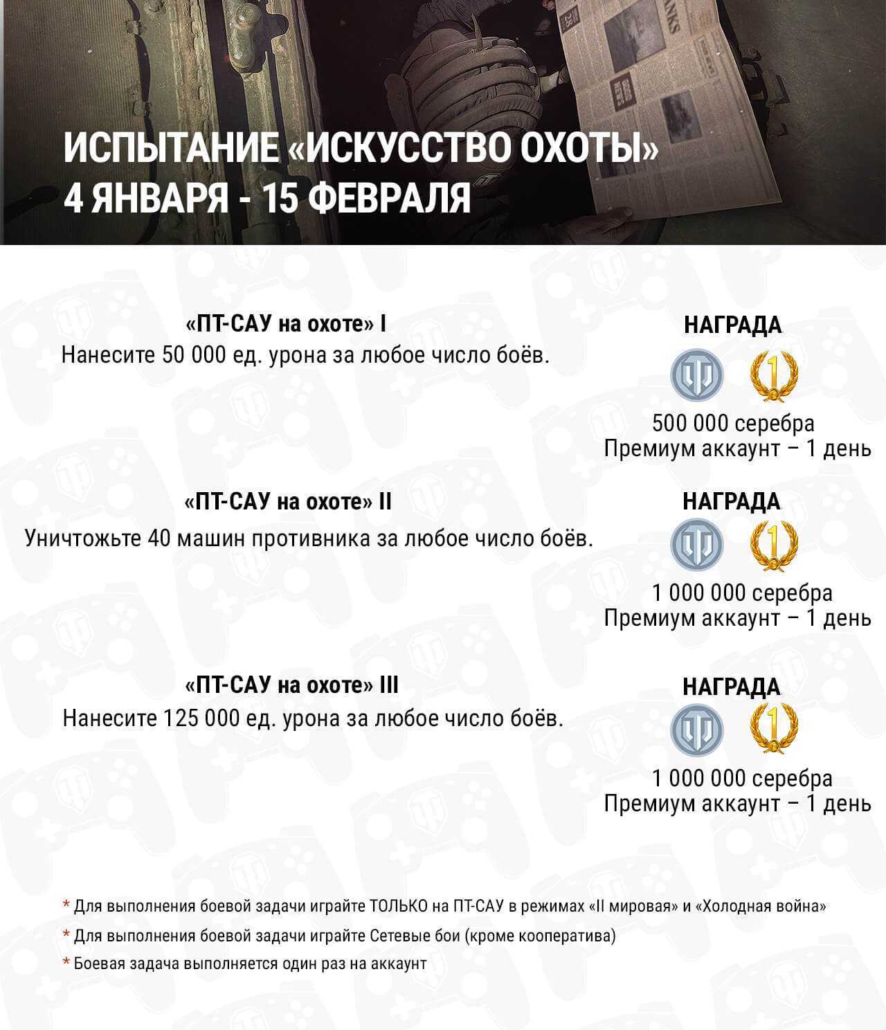 Техника: только для ПТ-САУ Режимы: «II мировая» и «Холодная война» Сетевые бои (кроме кооператива) Один раз на аккаунт |