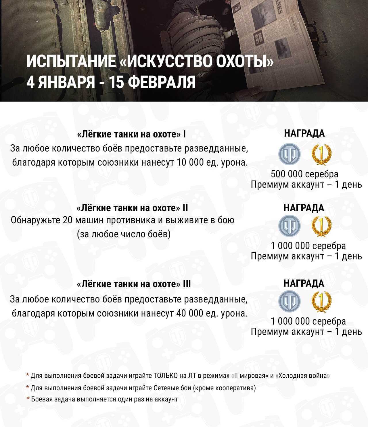 Техника: только для лёгких танков Режимы: «II мировая» и «Холодная война» Сетевые бои (кроме кооператива) Один раз на аккаунт |