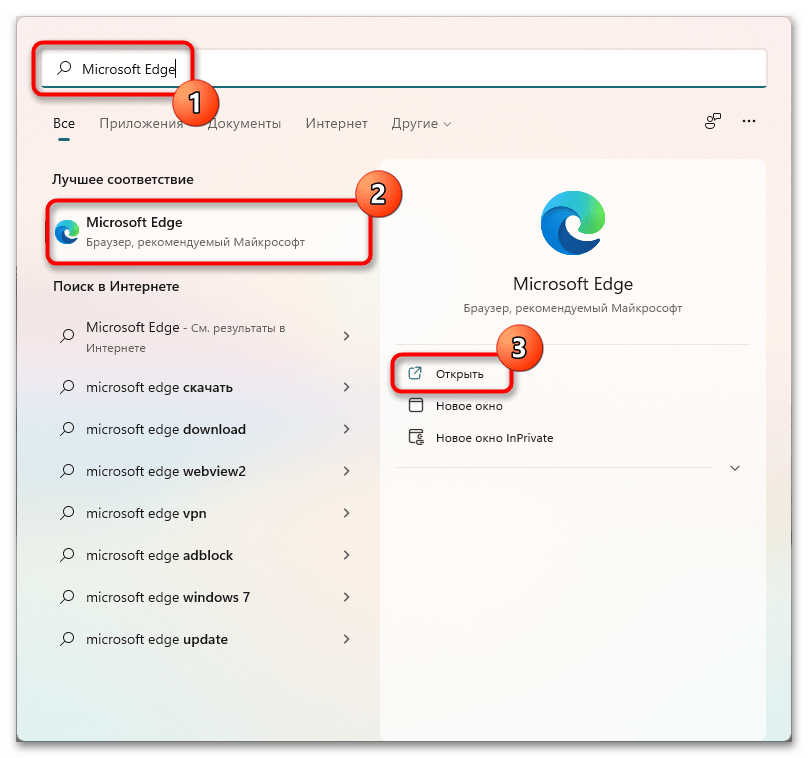 - Откройте Microsoft Edge, воспользовавшись поиском по системе. Для этого введите название приложения и кликните по соответствующей иконке в появившихся результатах.