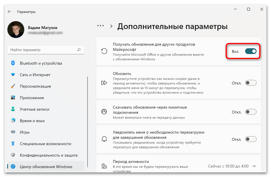 Установите в активное положение переключатель, который расположен напротив опции «Получать обновления для других продуктов Майкрософт».