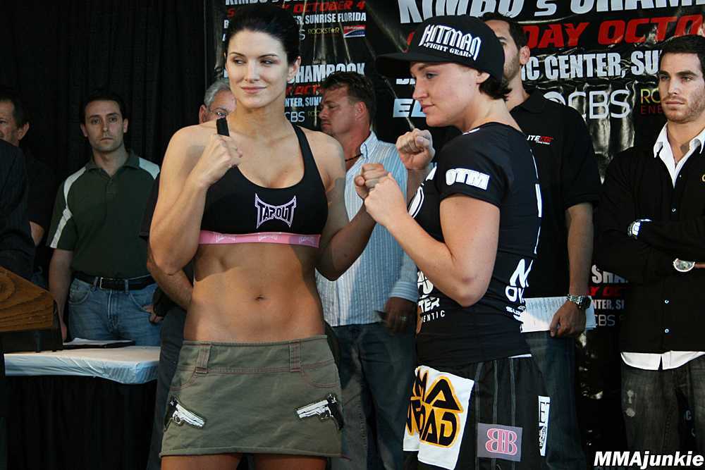 И вот, во время взвешивания перед боем с Кобольд выяснилось, что Карано снова не попадает в весовую. Тогда Джина, дико смущаясь, сняла топ и, прикрывшись полотенцем, встала на весы — перевес все еще оставался. Отчаявшись, Джина сняла с себя все и под светом камер встала на весы. И ей-таки удалось попасть в нужные параметры. Сами понимаете, такой шаг, транслировавшийся в прямом эфире, мгновенно сделал ее звездой. К слову, тот бой Карано выиграла решением судей.