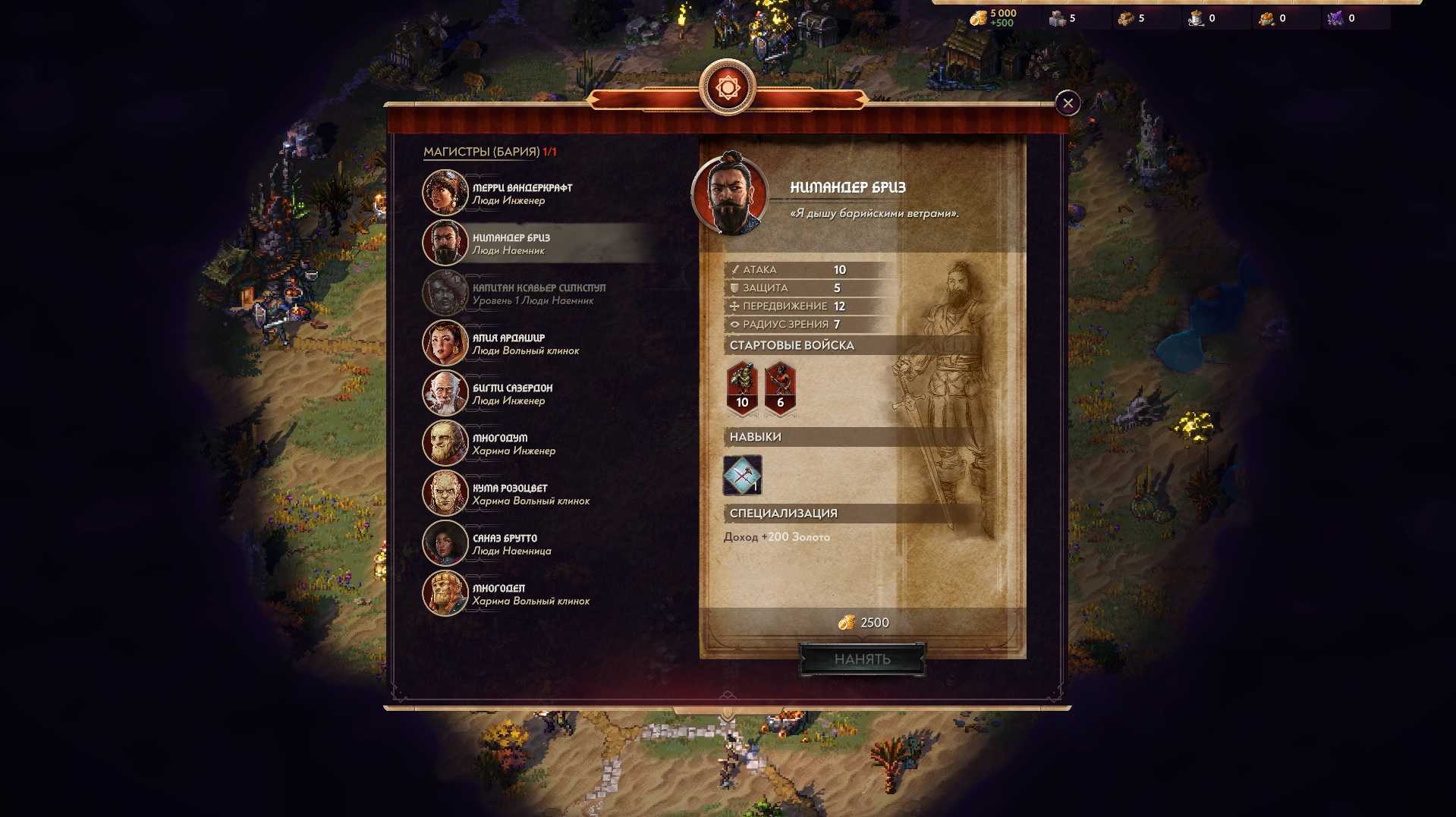 По мере получения новых навыков и предметов магистры становятся либо великими магами, либо могучими бойцами. Отдельно отмечу навык «Лидерство», позволяющий командовать большим числом отрядов. Сперва доступно три ячейки под войска, а разогнаться можно аж до девяти. Иначе говоря, Disciples на максималках. Если вы теряете вашего героя в бою, то на следующий день он снова доступен в местной таверне — цена падает с каждым днем, проведенным на том свете. Можно нанять и бесплатно, но запаситесь терпением.