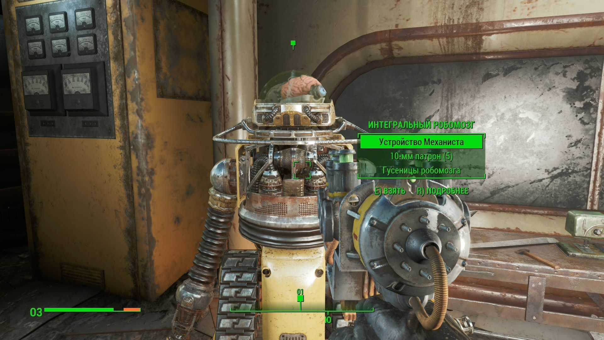 Поднимаемся на второй этаж по лестнице напротив входа в помещение и заворачиваем за угол, где за запертой дверью находится несколько недружественных роботов. Атаковать можно их и через решетку, так можно будет избежать рукопашного боя. Расправившись со всеми, откройте дверь с помощью терминала и заберите устройство механиста с интегрального робомозга.