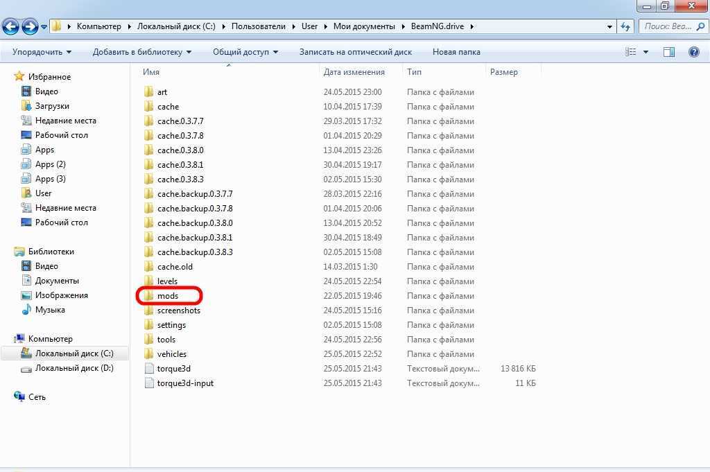 - Переместите файлы мода в папку mods Бименджи Драйв. Она должна находиться здесь – С:\Users\User\Documents\BeamNG.drive\mods.