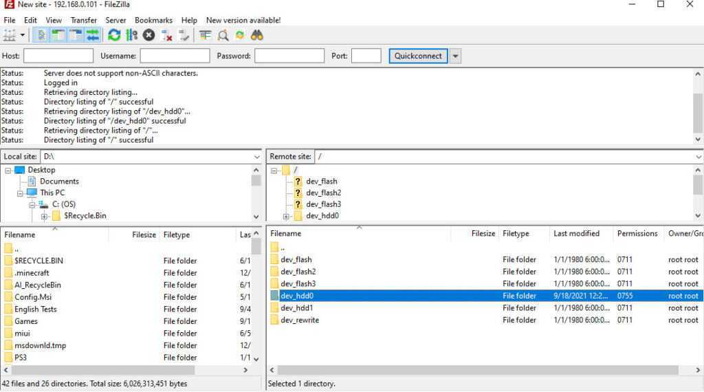 4. Открываем любой FTP Клиент и подключаемся к консоли через ПК. На примере FileZilla – File/Site Manager. В Окне Protocol указываем FTP; В Host указываем локальный IP Адрес консоли (В моем случае это 192.168.0.101) и жмем Connect.