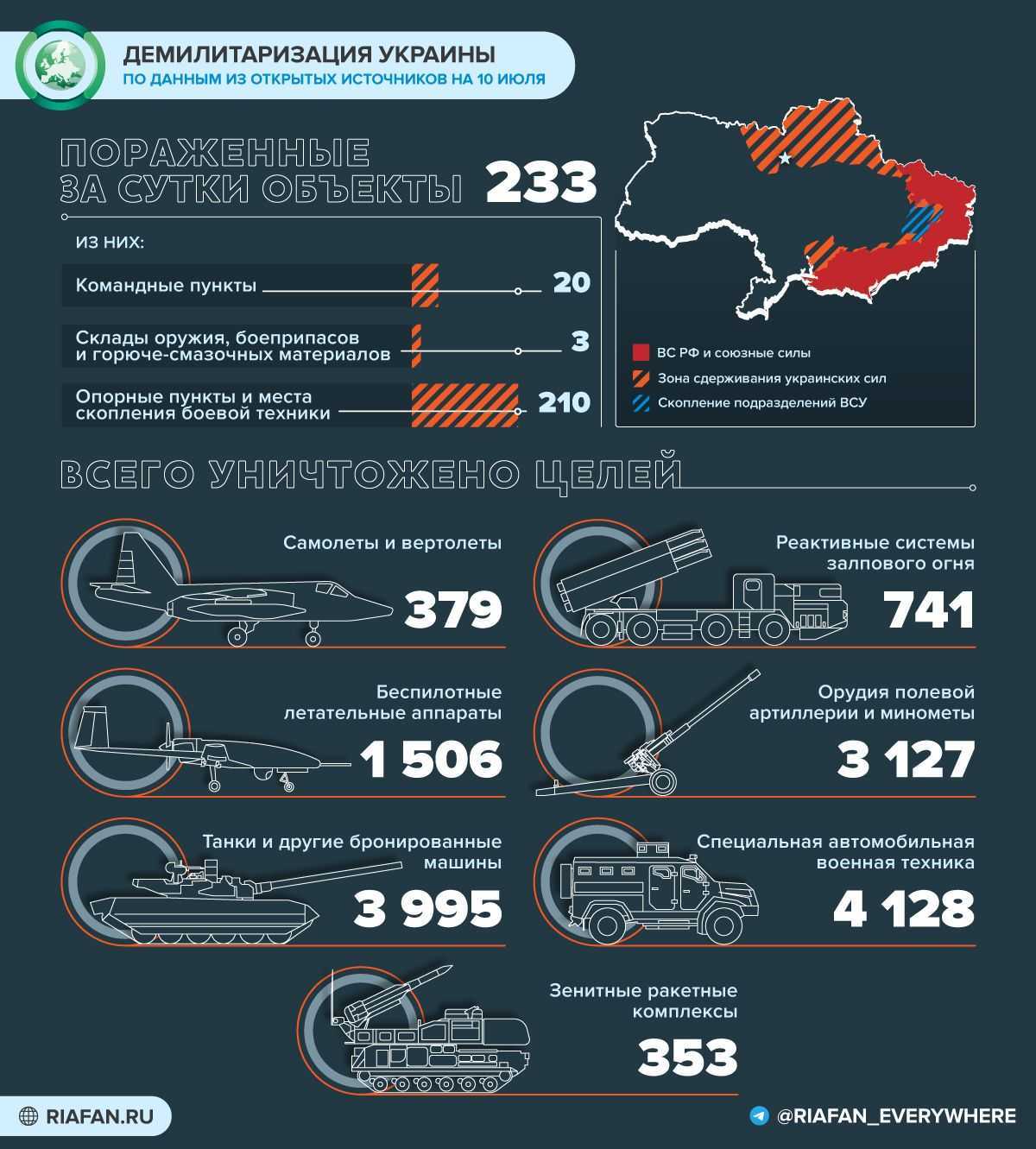 Всего же с начала проведения специальной военной операции ВСУ потеряли 242 самолета, 137 вертолетов, 1506 беспилотников, 353 зенитных ракетных комплекса, 3995 единиц бронетехники, 741 РСЗО, 3127 полевых орудий и минометов, 4128 единиц специальной военной автомобильной техники.
