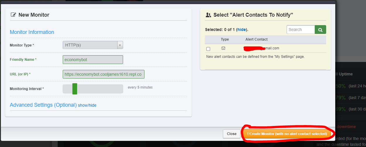 This part is relatively simple. If you have the Hacker plan, then you can use the AlwaysOn feature. Otherwise, you can use Uptimerobot.Simply create an account, create a new monitor, set it to http(s), enter your URL (either the repl.co one or a custom one), add a friendly name and an interval (5 mins is fine) and BOOM! Your website and bot should be kept alive!