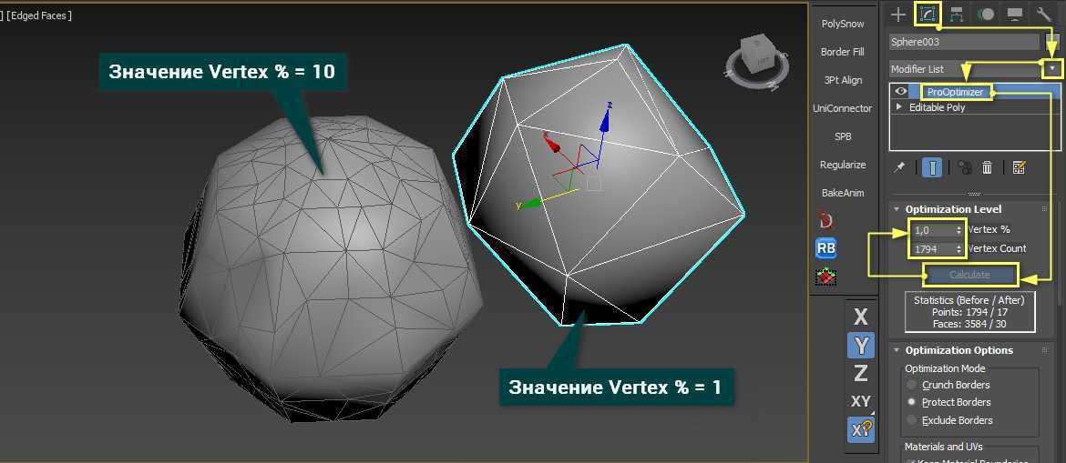 Принцип работы ProOptimizer очень схож с Optimize, но более автоматизирован. Он не имеет различных параметров настройки новых граней, из-за чего оптимизация менее гибкая. Но сам объект после оптимизации лучше сохраняет форму при меньшей трате времени на настройку. Лучше всего это будет видно на сложных объектах.