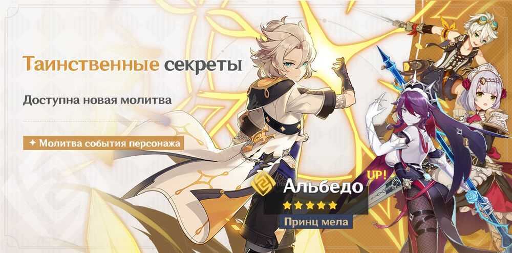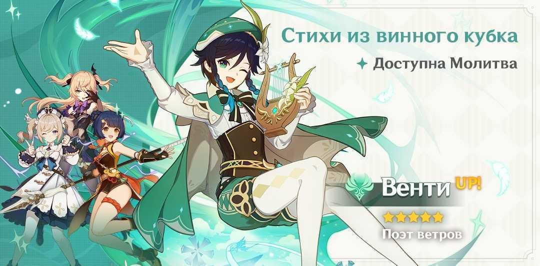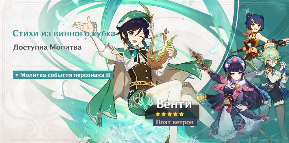 Молитва события персонажа — это баннер с персонажами с ограниченным сроком действия. Например, пятизвёздочный персонаж Венти, который был доступен на баннере «Стихи из винного кубка» . Вы не можете получить его из постоянного баннера с персонажами. Чтобы сделать временные баннеры более привлекательными, в Genshin Impact также повышается вероятность выпадения определенных четырехзвёздочных персонажей.