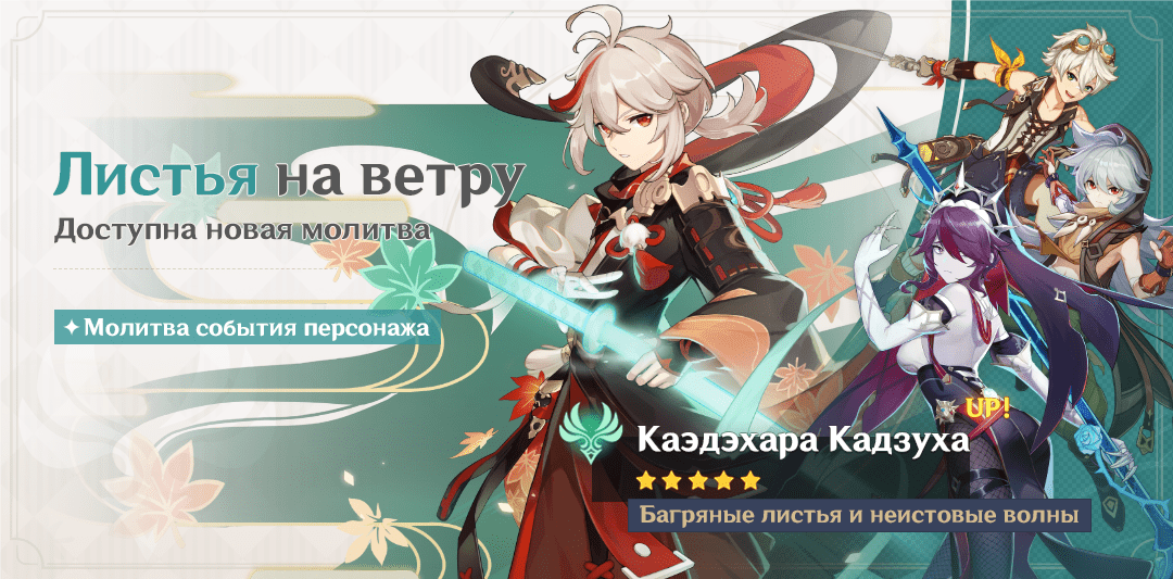Кадзуха (Анемо, одноручное) в молитве Листья на ветру. Четырехзвездочные герои: Сиканоин Хэйдзо (Анемо, катализатор), Тома (Пиро, копье), Нин Гуан (Гео, катализатор).