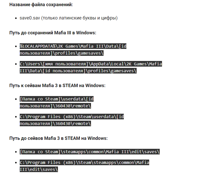 - LocalAppData → 2KGames → Mafia 3 → Data → Имя текущего пользователя → Профиль → gamesaves.