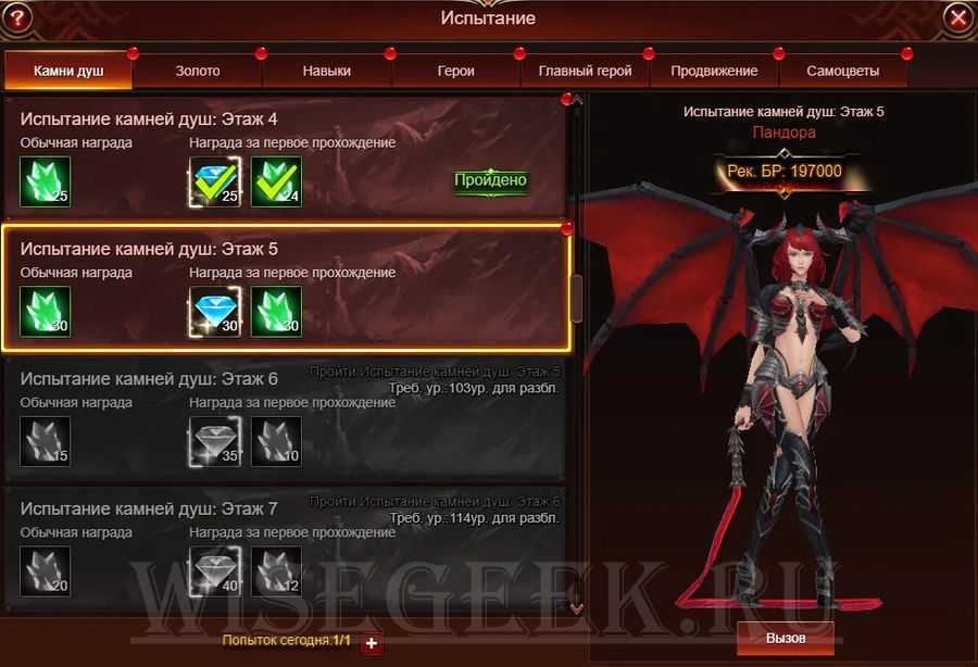 Испытание. Функционал открывается на 40 уровне. Всего вас ждет 7 испытаний, каждое из которых состоит из 13 этажей. Чем выше этаж, тем сильнее противник. Вам дается 1 бесплатная попытка на прохождение испытаний, дополнительные попытки можно докупить за алмазы. Их количество зависит от вашего уровня VIP. При первом прохождении каждого этажа вы получаете особую награду. Все последующие этажи открываются, когда вы зачистите предыдущие и достигнете определенного уровня.