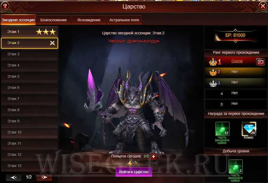 Царство. Функционал открывается на 56-м уровне. Функционал состоит из четырех вкладок, в каждой из которых вас будет ждать босс. Всего в каждой вкладке по 20 этажей, чем выше этаж, тем сильнее босс. Чтобы открыть следующий этаж, вам необходимо пройти текущий на 3 звезды.