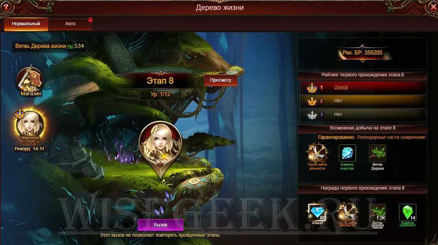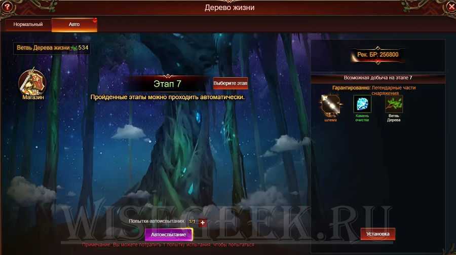 Состоит из двух частей: обычное испытание и авто. В обычном испытании вы можете зачистить этапы и уровни Древа только 1 раз. Если вы не успели зачистить этап за день, то прогресс прохождения будет сброшен. За каждый зачищенный уровень вы будете получать определенные награды: части снаряжения, алмазы (за первое прохождение), ресурсы и валюту функционала — ветви Древа. Как только вы пройдете очередной этап Древа, вам станет доступно его автопрохождение.