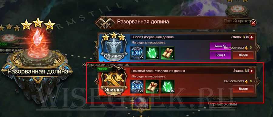 Чтобы открыть элитный этап, вам необходимо пройти обычный на 3 звезды (чтобы никто из героев не погиб). Одна попытка прохождения стоит 8 единиц выносливости, после первого прохождения вам становится доступен блиц (5 бесплатных попыток). Награды за элитные подземелья ценнее: в них в том числе можно получить части героев, а также Божественное оружие.