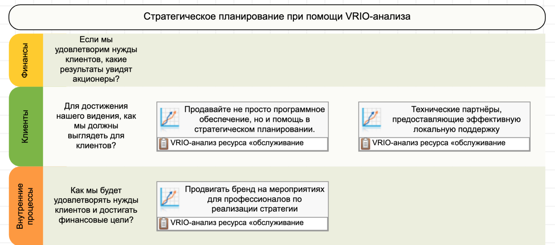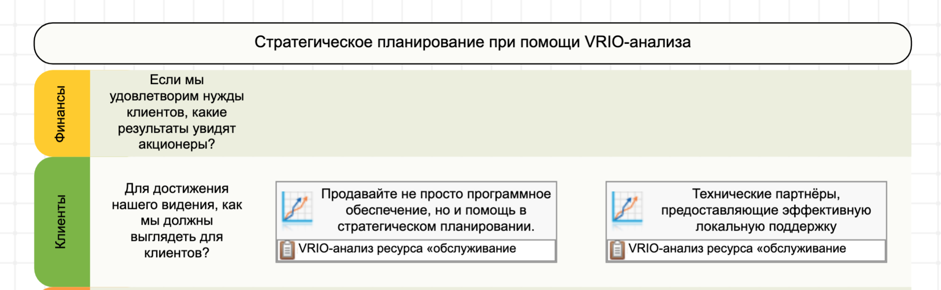 Я предпочитаю этот подход, потому что он упрощает использование результатов VRIO-анализа на стратегической карте и дает возможность сохранить результаты на случай, если нам понадобится обоснование новых стратегических целей.