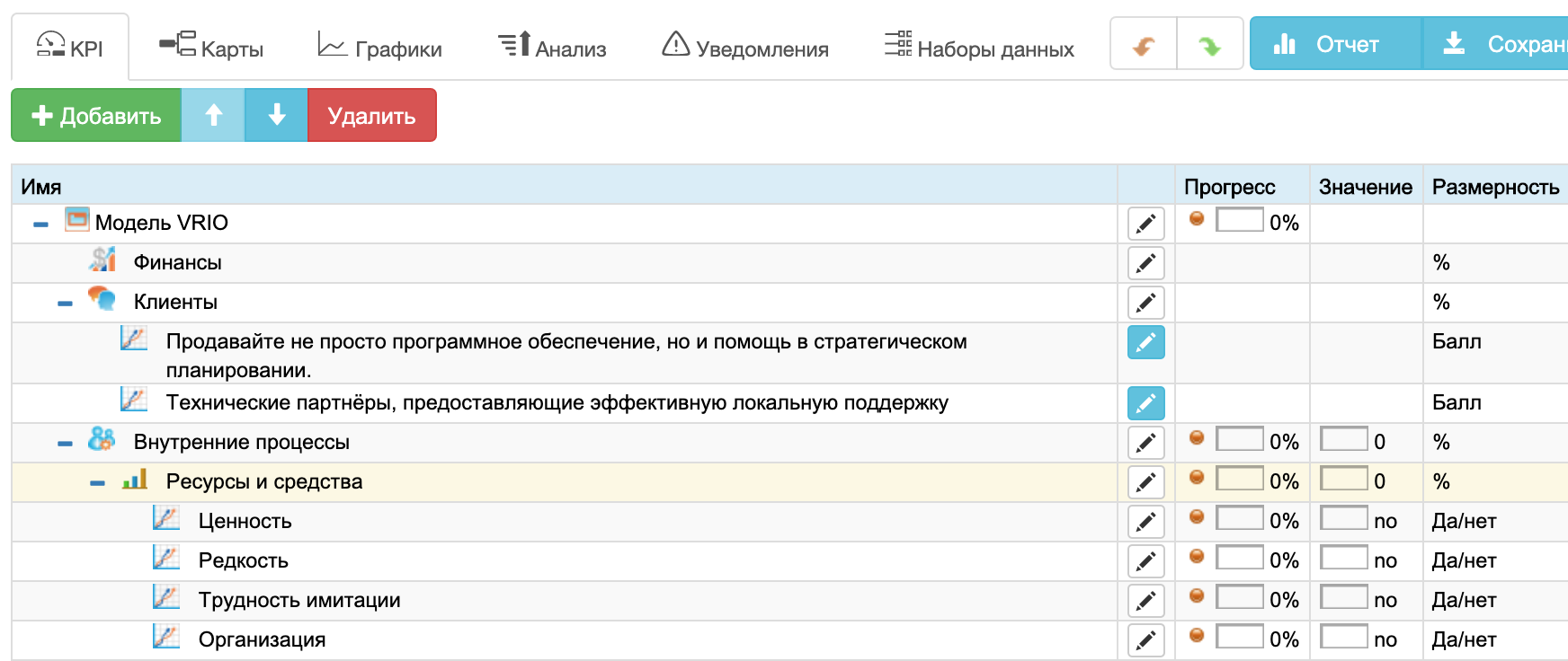 На вкладке «KPI» мы найдем блок «Ресурсы и возможности», находящийся во «Внутренних бизнес-процессах».