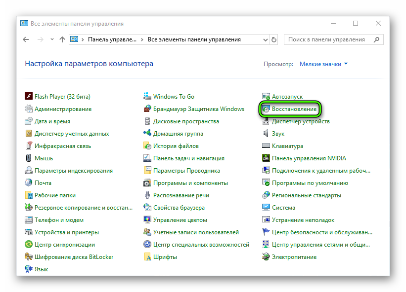 Второй представляется гораздо менее удобным, поэтому вкратце рассмотрим первый. Запустите «Панель управления» через «Пуск», переключите вид на «Значки». Здесь отыщите элемент «Восстановление» (в Windows 7 он может называться иначе).