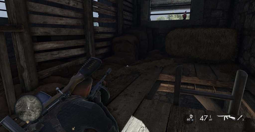 Когда вы будете охотиться за дополнительными зенитными орудиями для дополнительных миссий, вы окажетесь на восточной стороне карты и найдете лачугу. Обязательно хорошенько обыщите его, потому что сзади вы найдете вырытую в земле яму, которая на самом деле является туннелем, ведущим к нему. Спуститесь вниз, и вы найдете верстак SMG. Легкий.