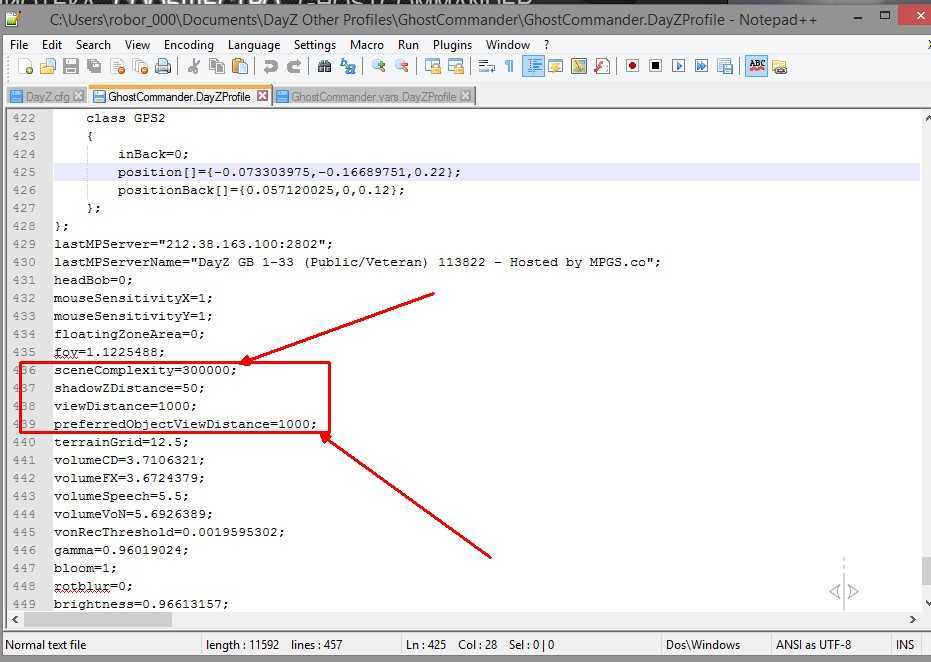 В этой папке нам нужен конфиг файл DayZ.cfg. Открываем его блокнотом и ищем строчки: